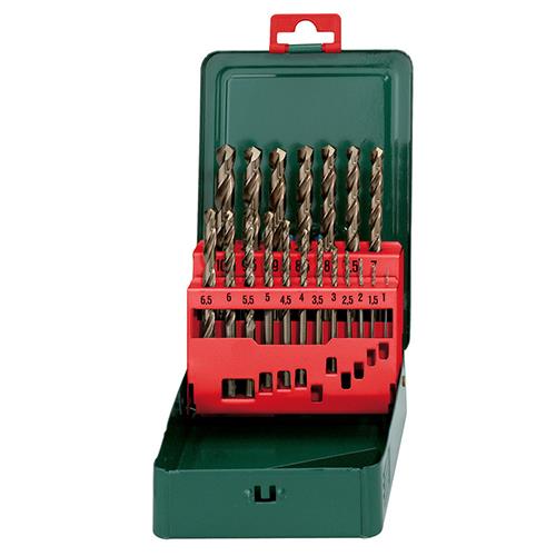 Metal drill bits, HSS-CO, cobalt alloy version, ground, cylindrical, type N, 135° crosswise grinding, bronze surface, 19 pieces, in metal case