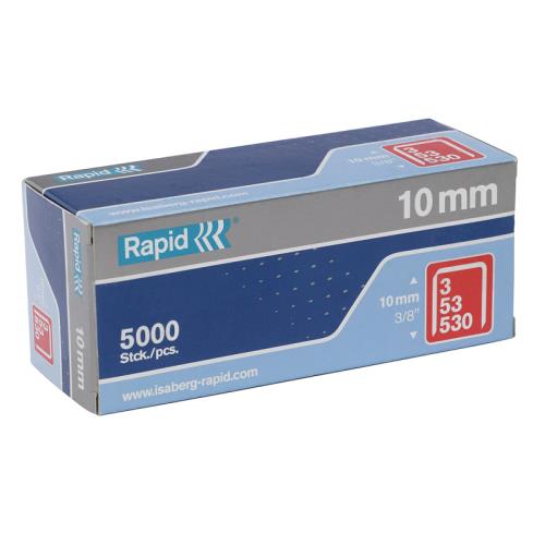 Rapid No. 53 precision cut fine wire staples are made from high performance galvanised steel for strength and durability. The fine wire makes the fixed staple almost invisible, ideal for fabrics, decoration, small construction and light repair.