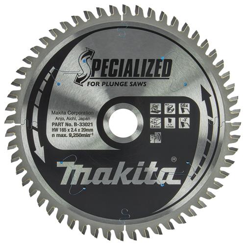 SPECIALIZED saw blade with 165mm diameter for cutting aluminium. The blade has 56 tungsten carbide tipped teeth, a kerf of 2.4mm and hole diameter of 20mm.