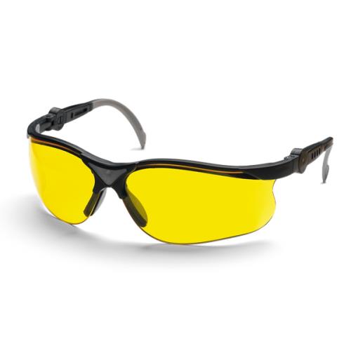 Protective glasses with non-scratch, yellow tinted lenses for better vision in dark conditions.